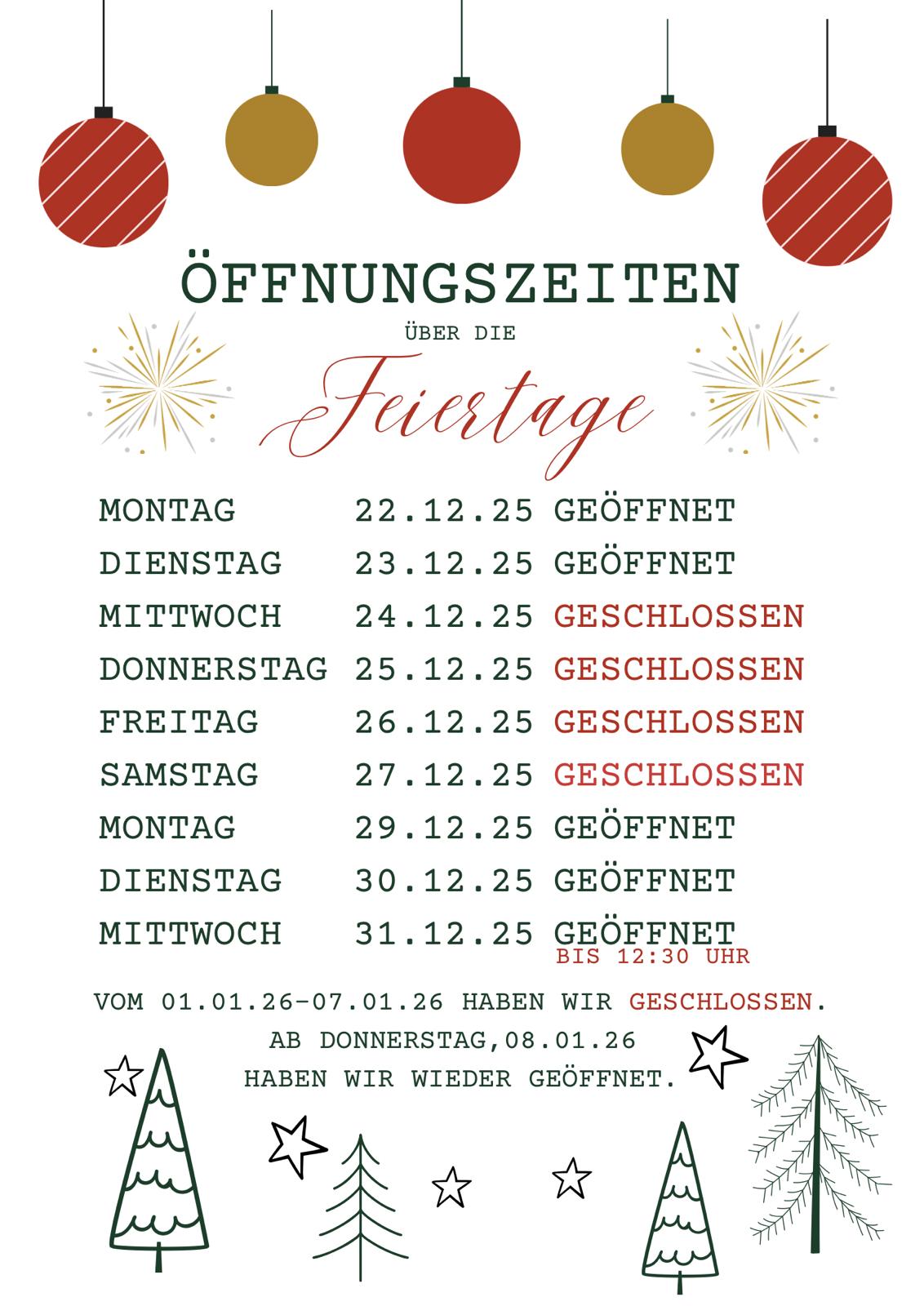 Der Dezember ist bereits angebrochen und Weihnachten steht vor der Türe. Damit ihr eure Weihnachtseinkäufe planen könnt und nicht umsonst zu uns fahrt, findet ihr hier unsere Öffnungszeiten über die Feiertage🎄🎆